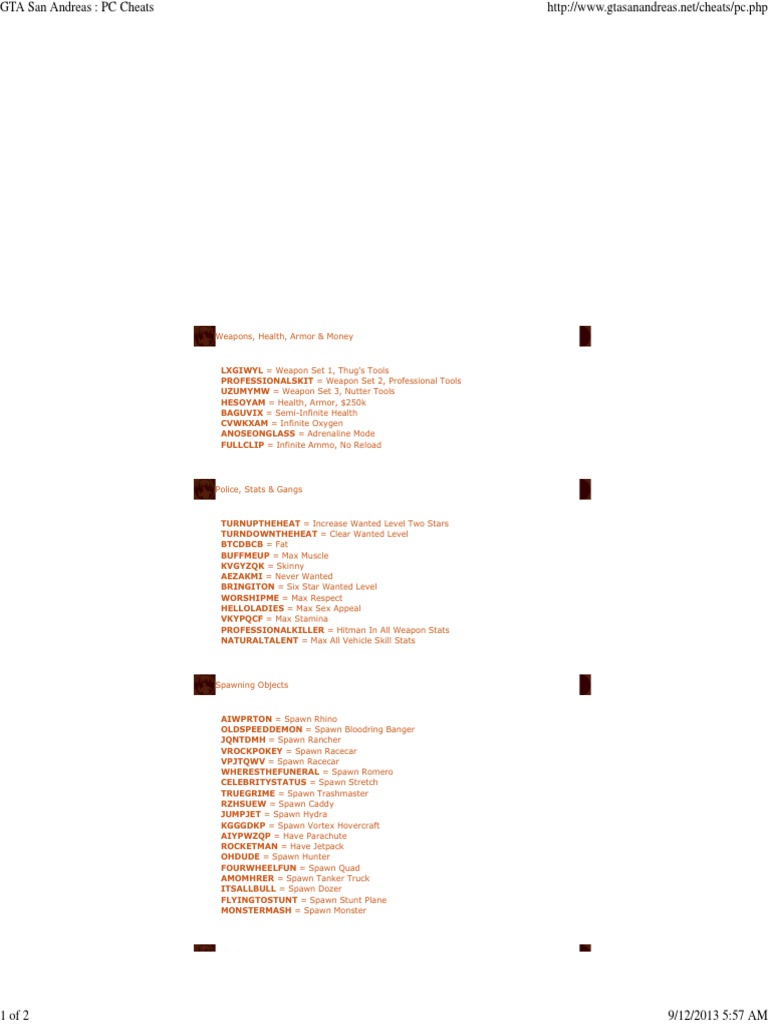 Grand theft auto san andreas features a large number of cheats, each with different effects. What's new in this version the 5 remaining phone cheat codes that were unknown have finally been discovered for the pc version of gta v and are now included in the app also added the newly discovered black cellphones code for gta v (pc/ps4/xb1) now has a separate corrected list of cheats for the ps3 version of san andreas corrections and updates to various translations there is now a. Grand theft auto san andreas cheats ps3 not working san andreas cheats san andreas download hacks gta san andreas cheats san andreas cheats san andreas gta Gta san andreas cheat codes effect cheat code adrenaline mode munasef all cars explode allcarsgoboom all cars have nitro coxefgu or speedfreak all green lights zeiivg always midnight nightprowler or xjvsnaj blow up all cars cpktnwt boats fly afsnmsmw or flyingfish cars float away when hit bsxsggc or bubblecars. Nov 17, 2021 · pin by m m on مرات الحفظ السريع in 2021 grand theft auto san andreas cheats gta cheat gta v ps3 gta v cheats gta 5 cheats ps4 cheating. Pick and mix the cheats you like best from our list. Here you find the full list of gta san andreas cheats for pc, including cheats for the definitive edition, such as maximum health, the money cheat, the ability to spawn vehicles, change the weather, and many more. Download full list of all gta san andreas game cheat codes grand theft auto san andreas is a best action adventure pc game from rockstars.it is an epic game among gamers around the world.even it is about two decades, gta sanandreas remains at the top of game world.developed by rockstar north games and released on 2004. Jun 07, 2005 · for grand theft auto: Nov 12, 2021 · also read: Cheats for gta san andreas to improve your gaming joy! Cheats for gta san andreas android latest 0.6 apk download and install. Gta san andreas cheats for pc.zip size: